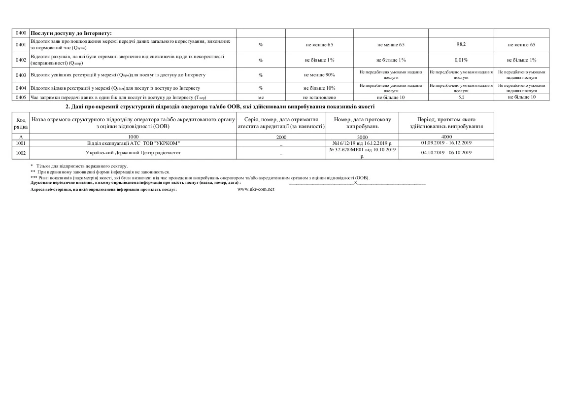 0401Відсоток заяв про пошкодження мережі передчі даних загального користування, виконаних за нормований час (Qзупн)%не менше 65не менше 6598.2не менше 65
